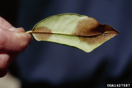 Phytophthora kernoviae na Rhododendron spp.: simptom, na Rhododendron spp., nekrotične pege na listih (foto. Central Science Laboratory Archive -)