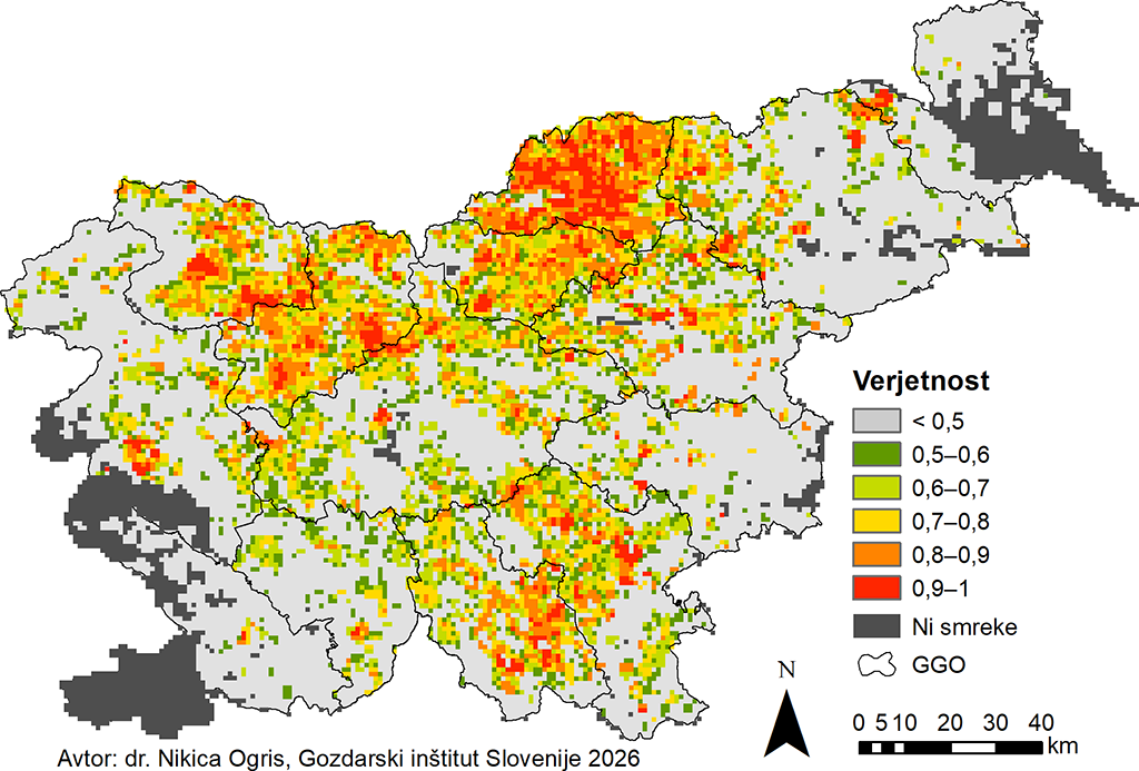 Citiranje: Nikica OGRIS, Maarten de GROOT. 2026. Verjetnostna napoved sanitarnega poseka smreke zaradi podlubnikov v Sloveniji v 2026. Napovedi o zdravju gozdov, 2026. URL: https://www.zdravgozd.si/prognoze_zapis.aspx?idpor=76. DOI: 10.20315/NZG.76
