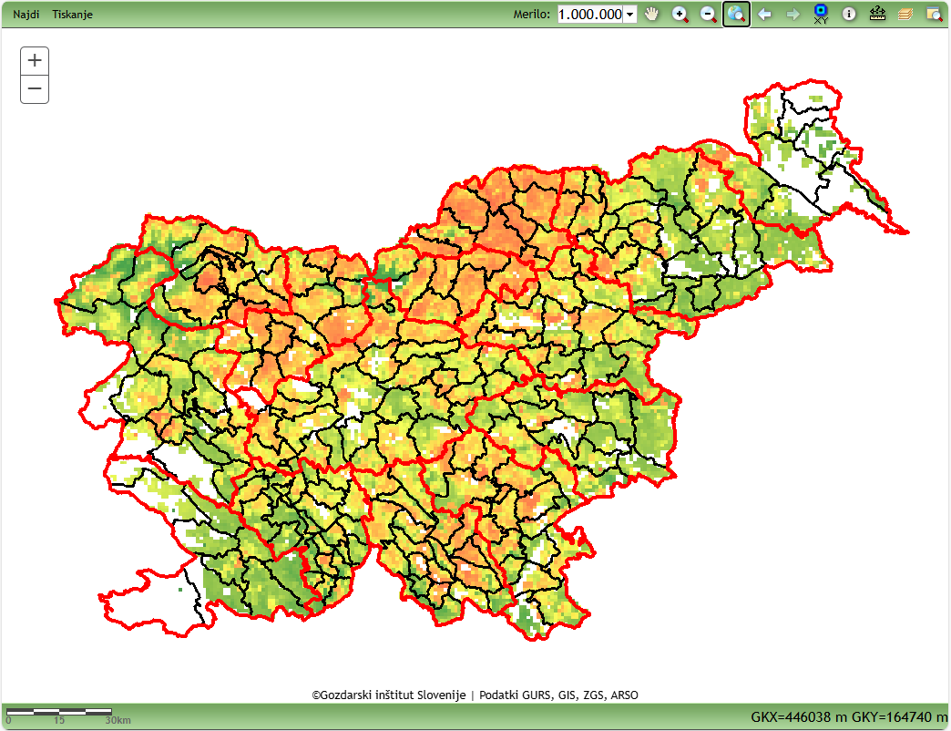 Rezultate napovedi sanitarnega poseka smreke zaradi podlubnikov s pridom uporabimo za bolj osredotočeno iskanje novih lubadark. Za ta namen smo pripravili pripomoček, tj. spletno interaktivno karto, na kateri lahko poiščemo območja z večjo in manjšo verjetnostjo pojava sanitarnih sečenj smreke zaradi podlubnikov v Sloveniji v letu 2026 (slika 2). Zaradi relativno visoke zanesljivosti napovedi (de Groot in Ogris, 2019) verjamemo, da bo njihova uporaba pripomogla k hitrejšemu in bolj učinkovitemu ukrepanju. Poleg tega lahko napoved sanitarnega poseka smreke zaradi podlubnikov uporabimo tudi širše, npr. za načrtovanje gozdnogospodarskih dejavnosti, za načrtovanje razporeditve dela, za načrtovanje ukrepov varstva gozdov idr.
